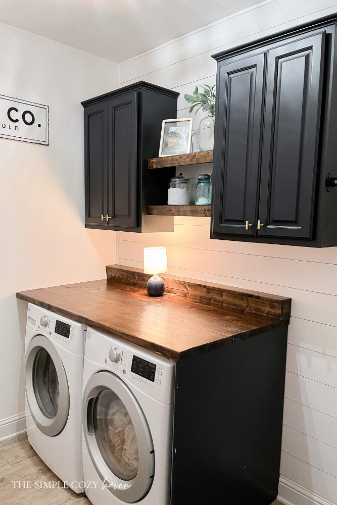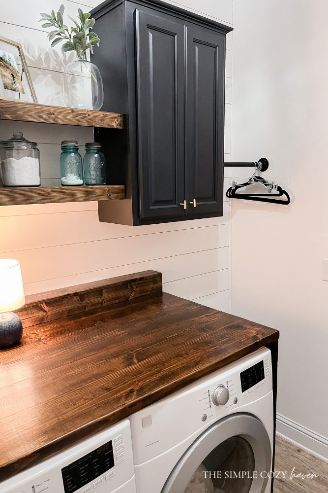 When we first purchased our home in 2018 our laundry room was anything but special. It had the basic wire shelving going across the wall above the washer and dryer but that was it. Oh yeah, there was a boob light, too!