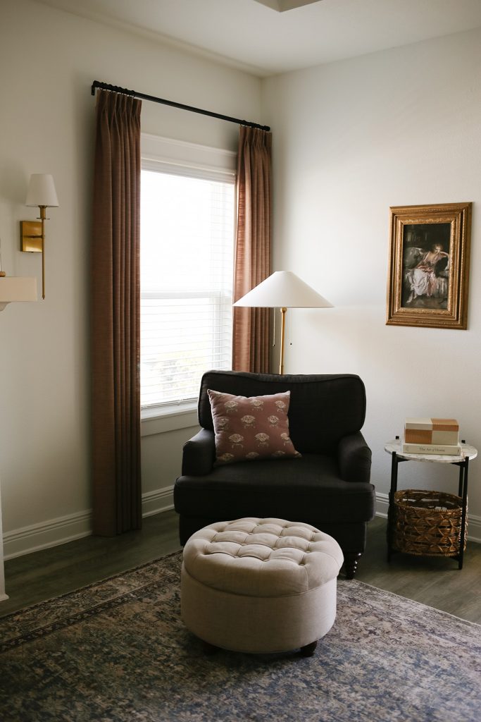 I added this scalloped woven tray from Homegoods to my island and filled my vase with plum florals to bring in some warmth. I always have an Antique Candle Co. candle in my home; my current favorite is Spice Cake. This was a collaboration with Karlee Gail Bowman. If you don’t follow her, I suggest you check her out!
