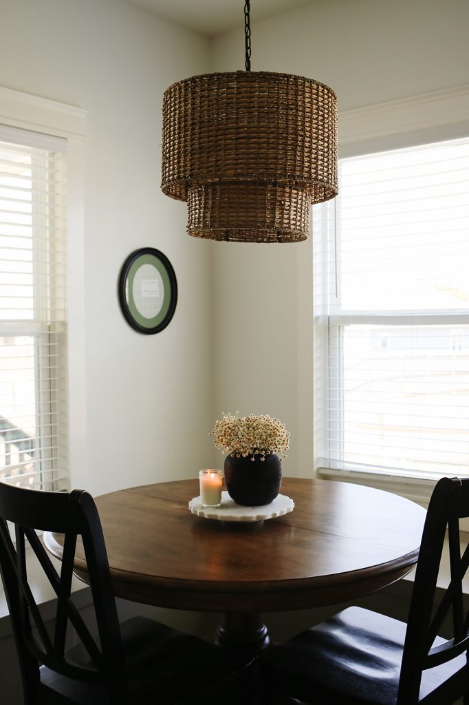 I keep our dining table clear for the most part because it usually becomes my homework table or where I work on things. I don’t want to feel like I have to reset this area and decor all the time. Maybe that will change in the future, but for now, I keep it very minimal.