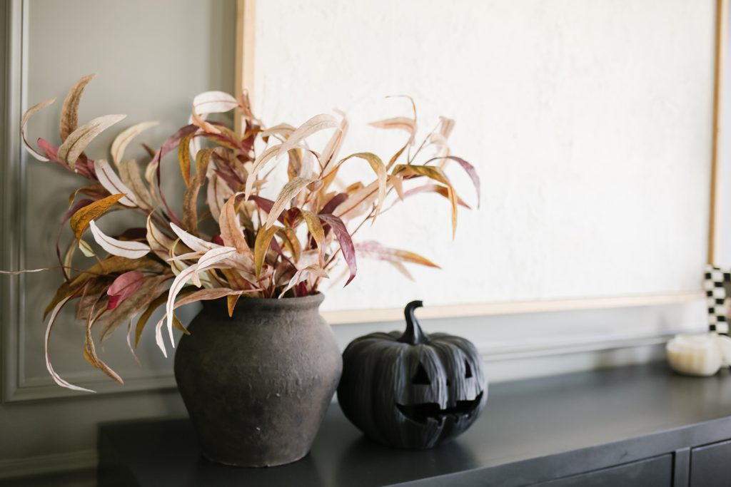 I added a painted jack-o-lantern and another metal one to the other side, which I keep a diffuser in. It looks so fun and spooky when the diffuser runs, and the mist emerges from the jack-o-lantern’s face.