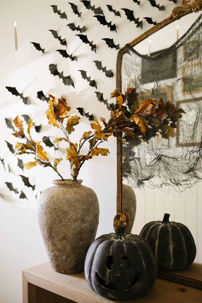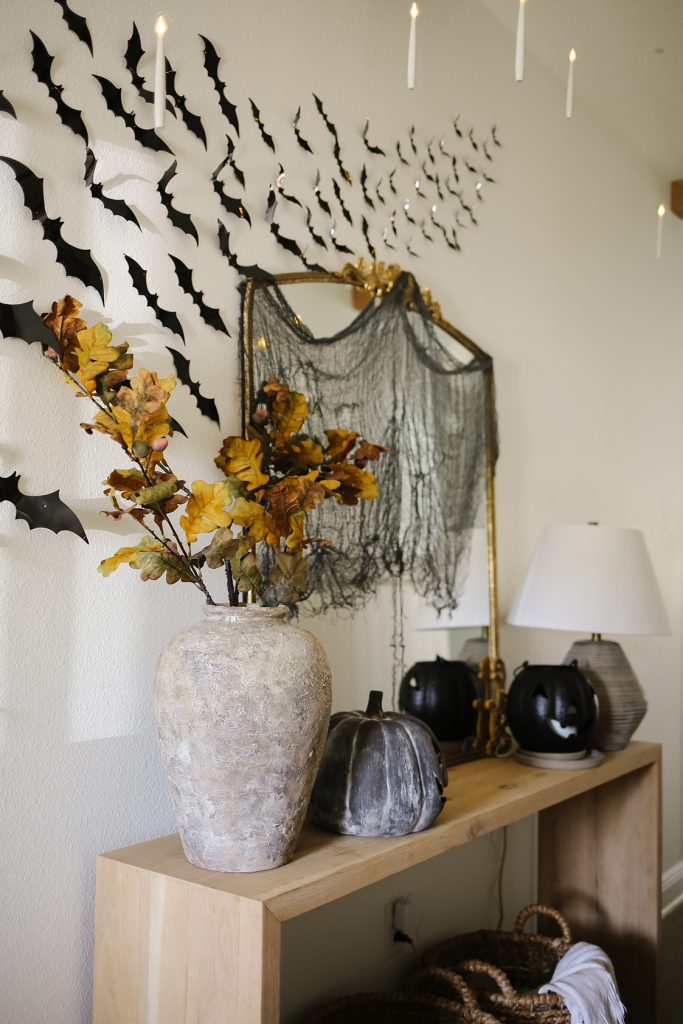 I added these bats to the wall around my entryway table to look like a swarm flying into the house. You can find them here. I used these sticky dots to attach them to the wall. I’ve used the sticky dots on the exterior of my home, and they never fell off—they’re great quality!