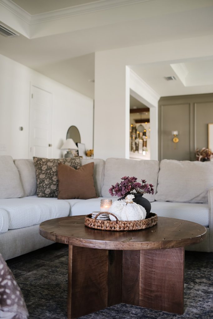 I added a few new pillow covers to our throw pillows. This added a warm touch that helped bring all of the colors together. On the coffee table, I kept a woven tray with a vase of purple florals and a fabric pumpkin I got a few years ago. Here’s a blog post on how to create fabric pumpkins.