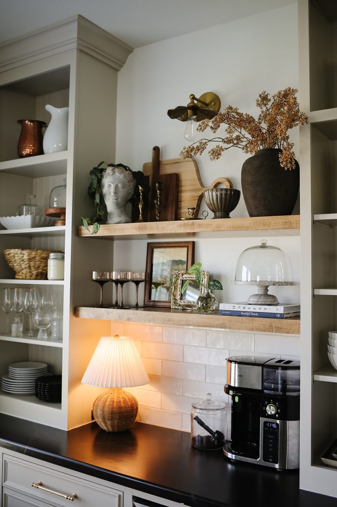 Off the side of our kitchen, we have a breakfast nook area where we have done lots of work. We have been slowly working on a dry bar build, and I am so excited to say that the glass doors are coming SOON! I love that we added these large wood shelves in between the towers of this space because I have even more room to decorate!
