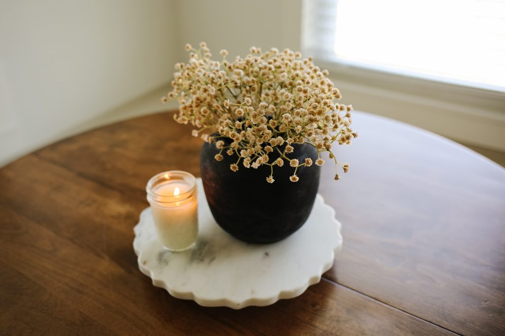 On the breakfast table, I added a marble lazy Susan with beautiful scalloped edges. On top, I kept a candle and this small pot with some faux stems.