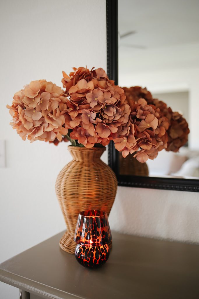 I found this antique dresser on Facebook Marketplace on the other side of our french doors. I added the viral Aldi wicker vase and these salmon-colored hydrangea stems to the top.