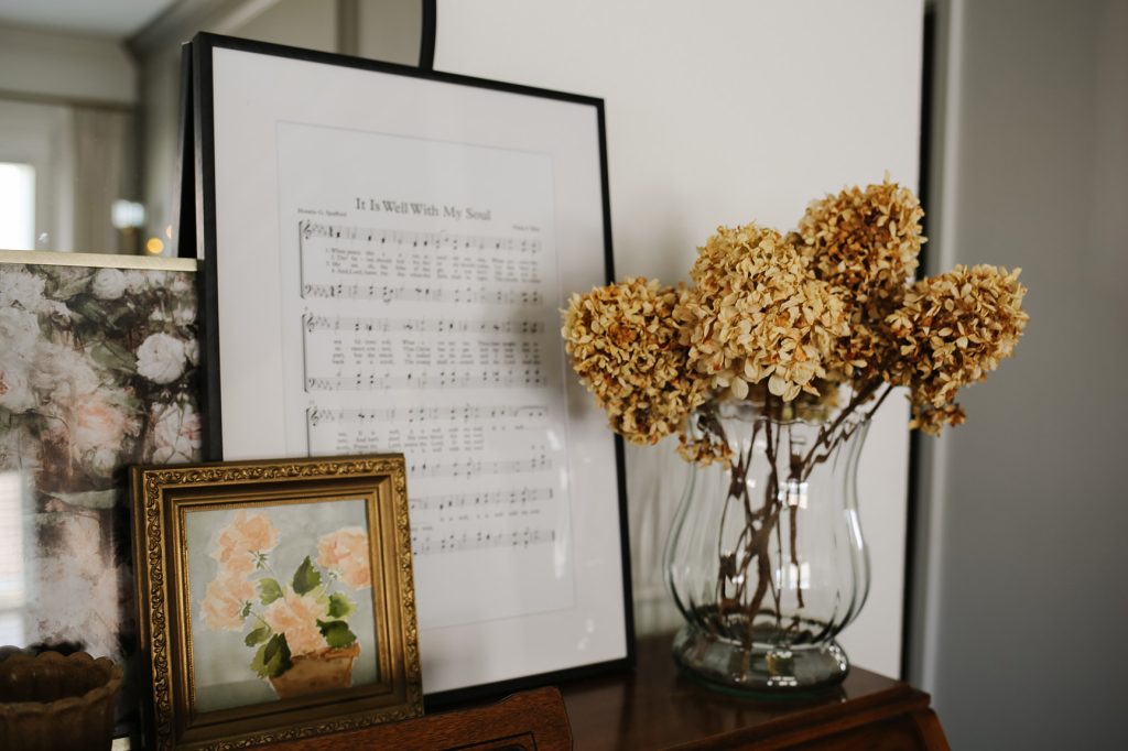 I also added this glass vase, which I found on Facebook Marketplace, and filled it with dried limelight hydrangeas from my backyard.