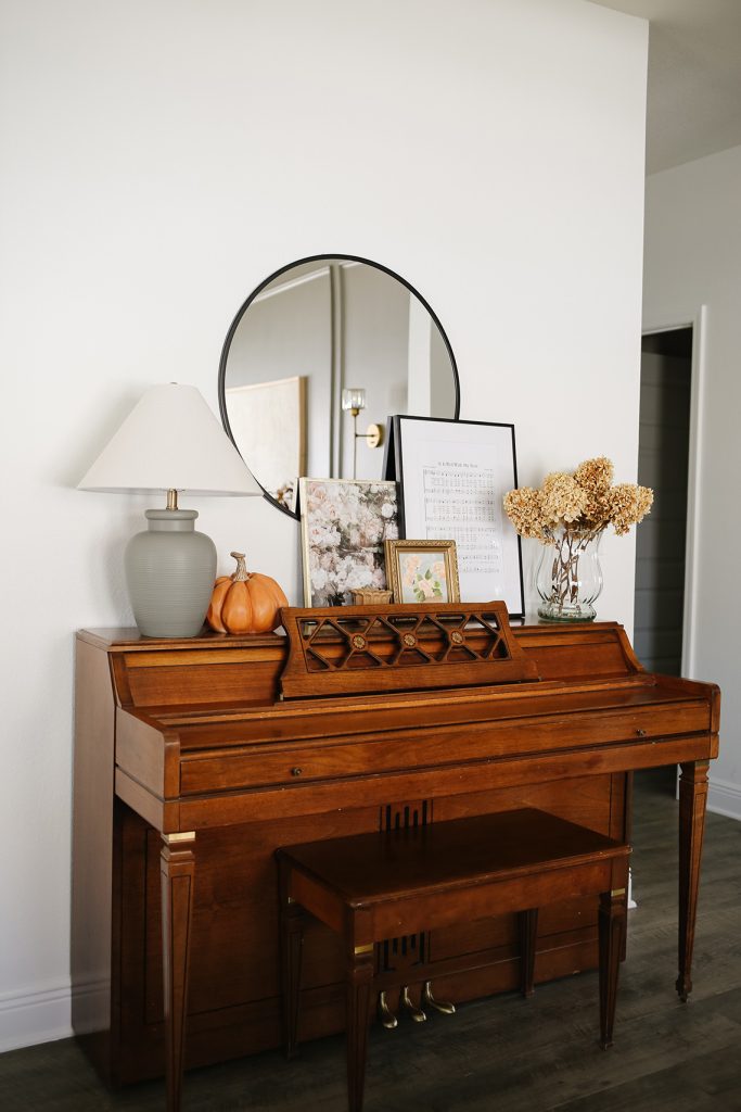 I don’t change the decor on my piano often, but I do switch some things around for the seasons. This year, I added a simple pumpkin to the top of the piano.