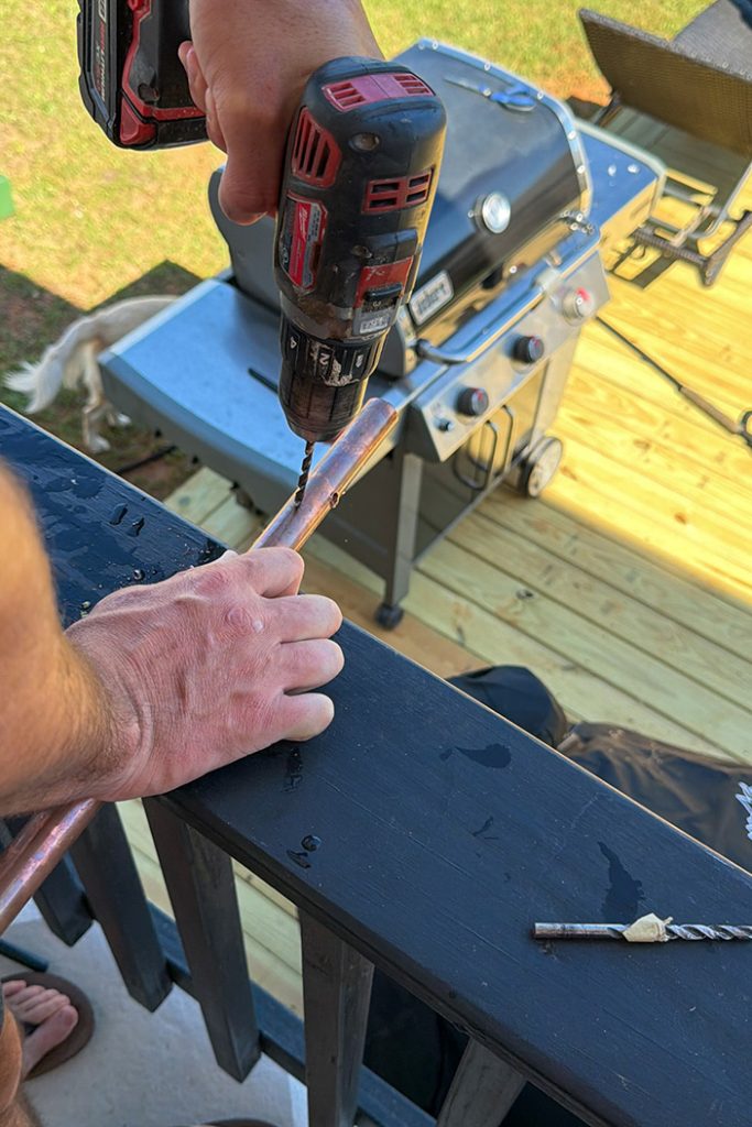 After testing the fountain, we found that the lowest pressure setting was still too high for our liking. To fix this, we drilled several holes near the bottom of the copper pipe to reduce the water pressure.