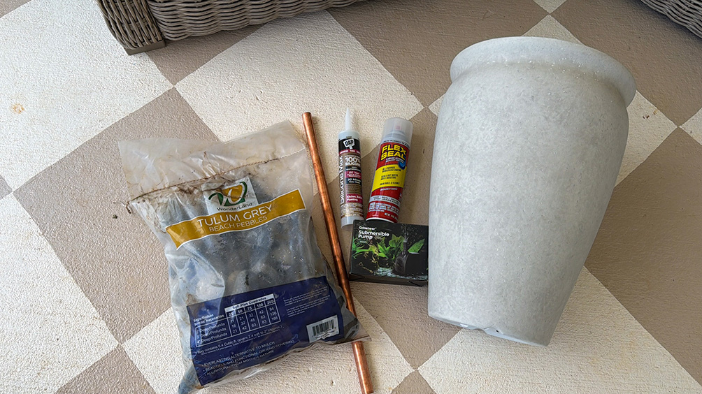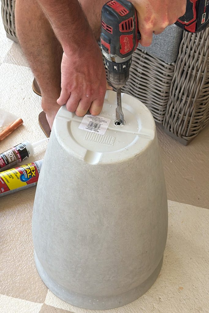 After you’ve chosen your planter, start by drilling a one-inch hole in the bottom (or just large enough for your pump’s electrical plug to fit through).