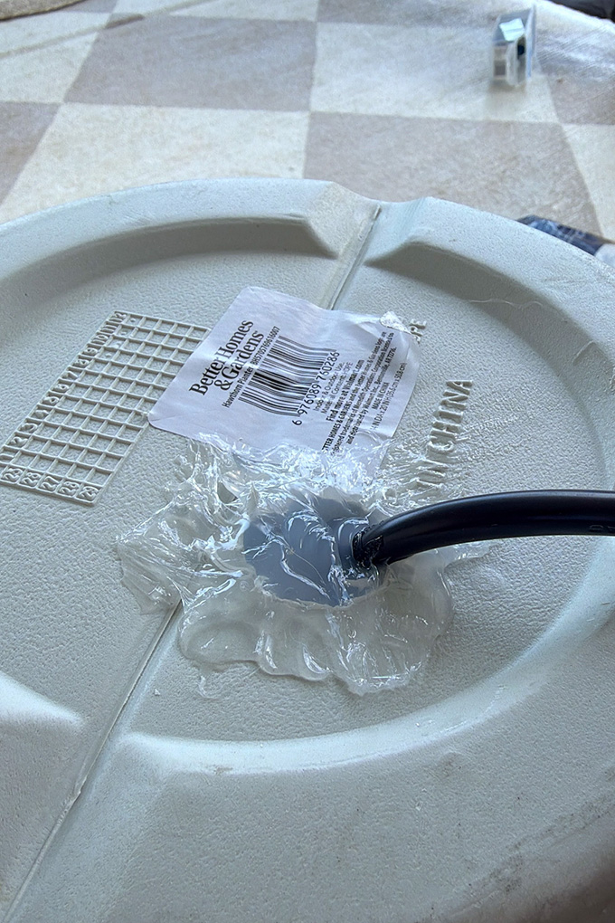 Place the planter upside down and set it on the cord to keep the pump upright. Then we ran a few small beads of silicone around the edges of the hole to begin filling in the gap. Once that had been set up for about 20 minutes, we continued with a few more beads of silicone until the entire hole was covered from the outside. Don’t add too much silicone, as this will lengthen your dry time.