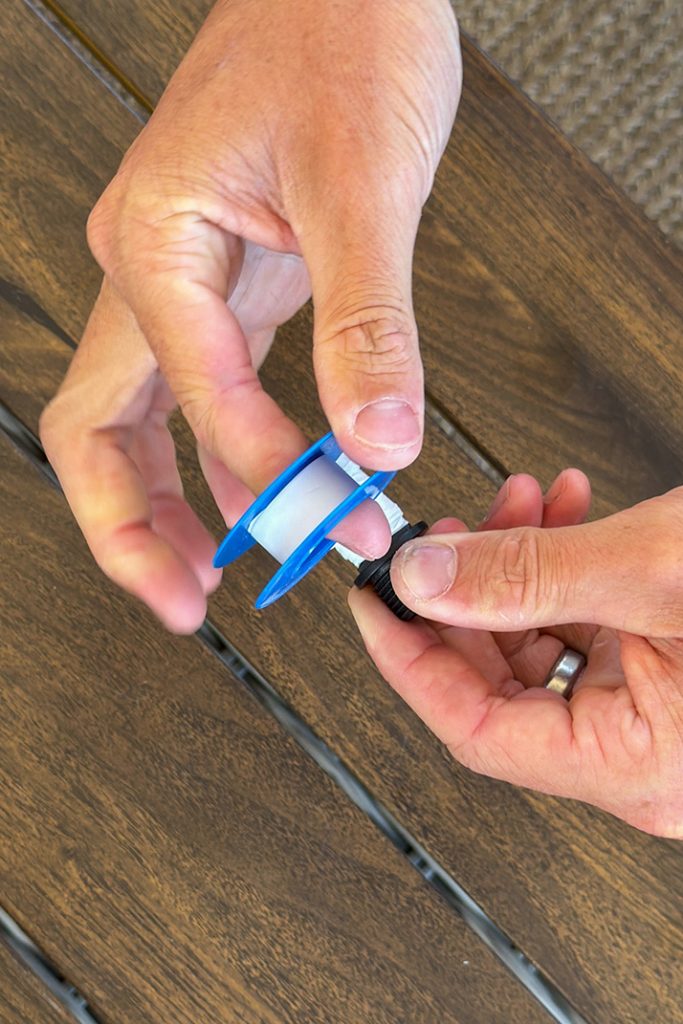While we were waiting for the silicone and flex seal to dry, we applied Teflon tape to the threads of our pump insert to ensure a tight, leak-free fit with our copper pipe. We cut the pipe to size with a cut-off wheel on an angle grinder.