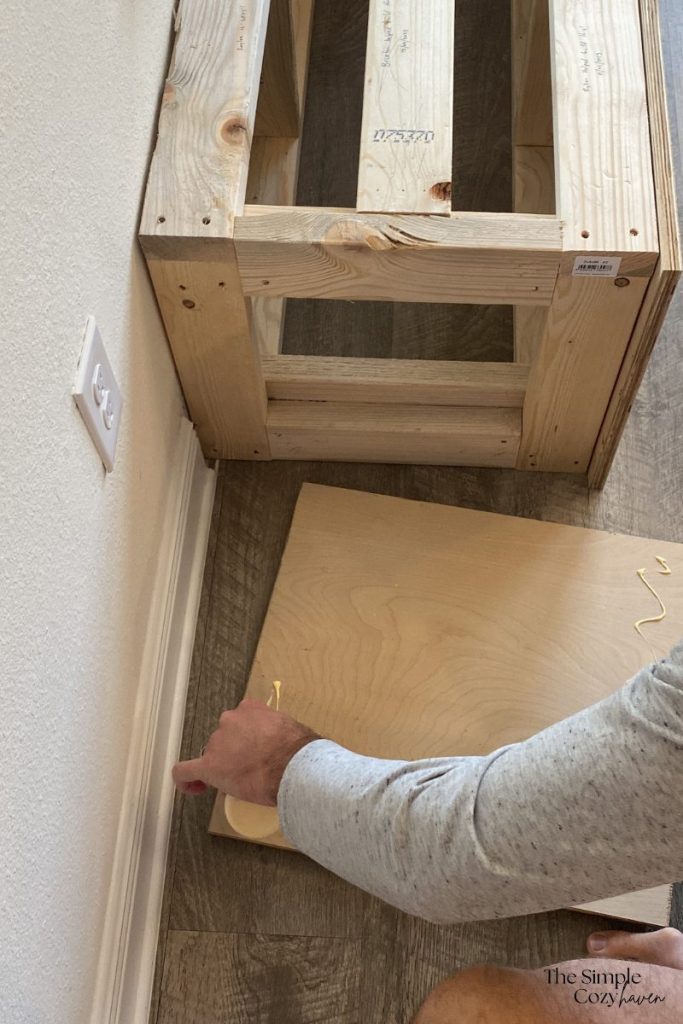 TIP: make sure your top piece is flush with the side walls; this way, you don’t have any unsightly plywood edges exposed. This will be covered with the trim pieces.