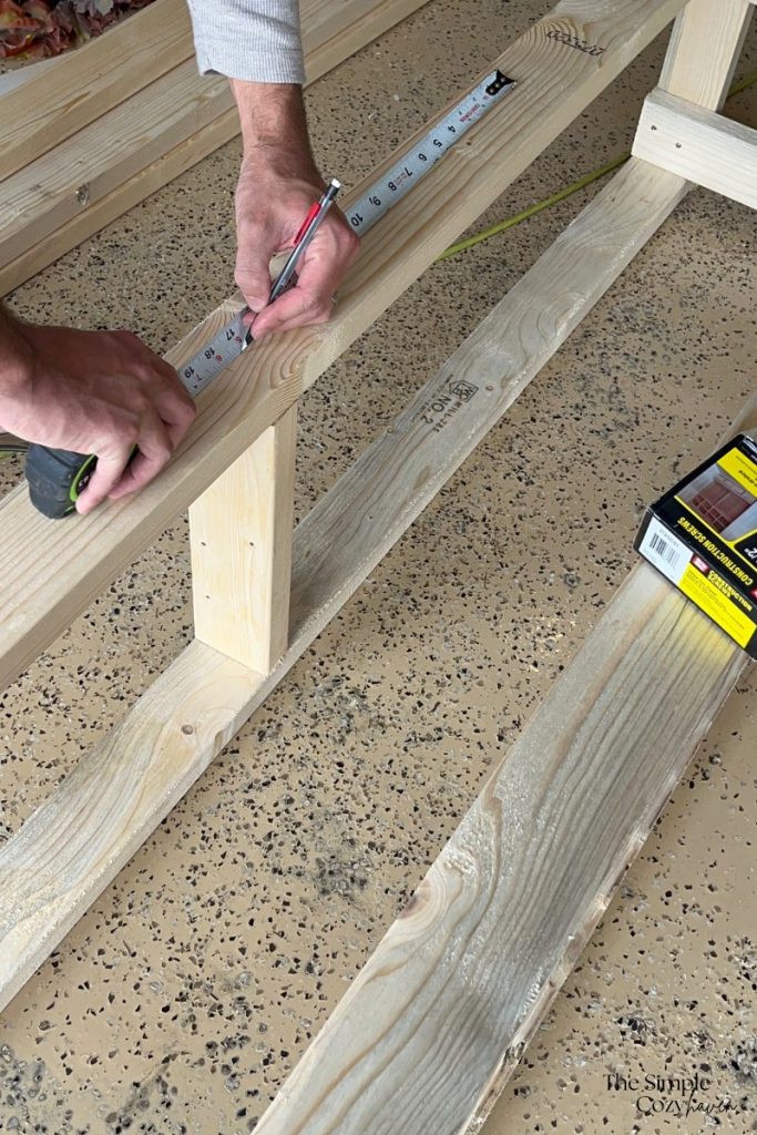 We used 2″ x 4″ boards to frame out the rough dimension of the banquette. We added multiple horizontal and vertical supports to strengthen and prevent sagging and warping.