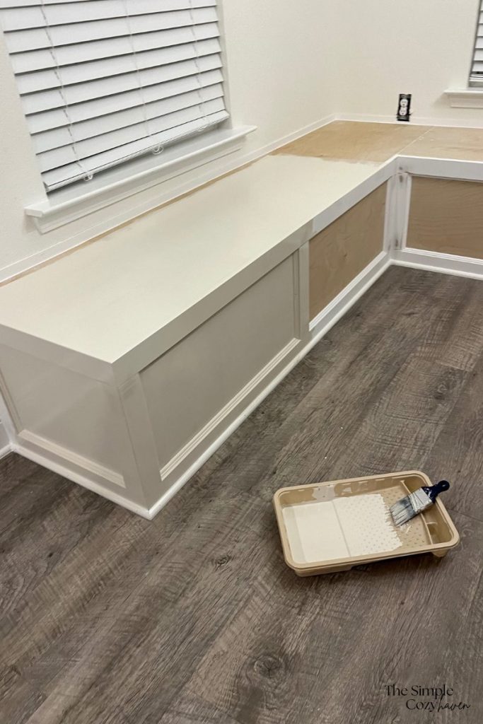 We painted the banquette with Sherwin Williams Emerald Trim paint in Accessible Beige at 90%. We used This color on our dry bar build in the same room, so I wanted them to match.