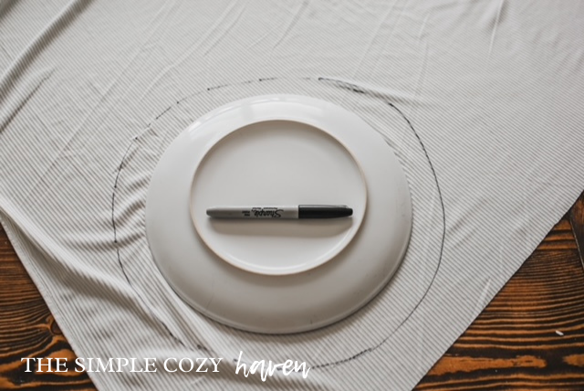 Lay your fabric of choice out on a table and trace your round object. I traced mine about an inch bigger just to make sure my pumpkin would be a good size.