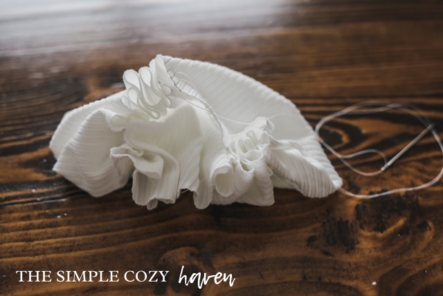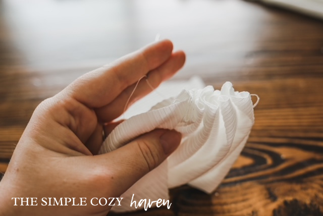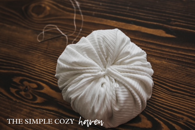 Thread your needle and put a knot at the end of the thread. I started from the inside of the pumpkin that way my knot would be hidden. Stitch a line about 1/4″ away from the edge of your fabric. I would space my stitches about an inch away on my smaller pumpkins and 2 inches on the larger ones. If you pull your thread tight your fabric should gather together.