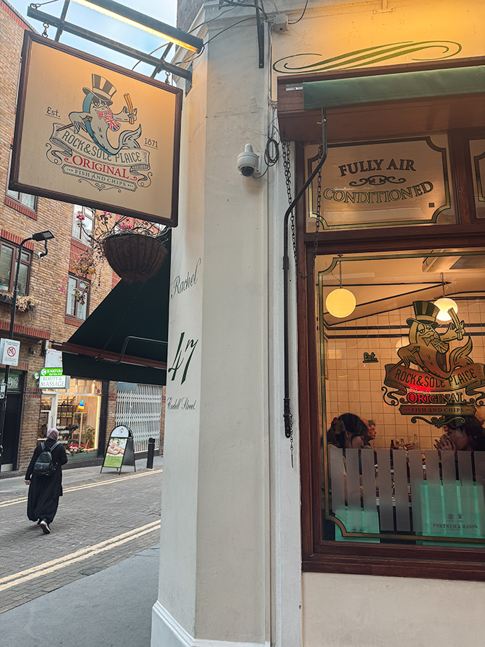 We people watched at Buckingham Palace for a bit while we decided what we wanted to do for dinner. We were searching for the best fish and chips in London on TikTok, and found a place called Rock and Sole Plaice. It’s located in the SOHO area, and about a 30 minute walk from the palace.