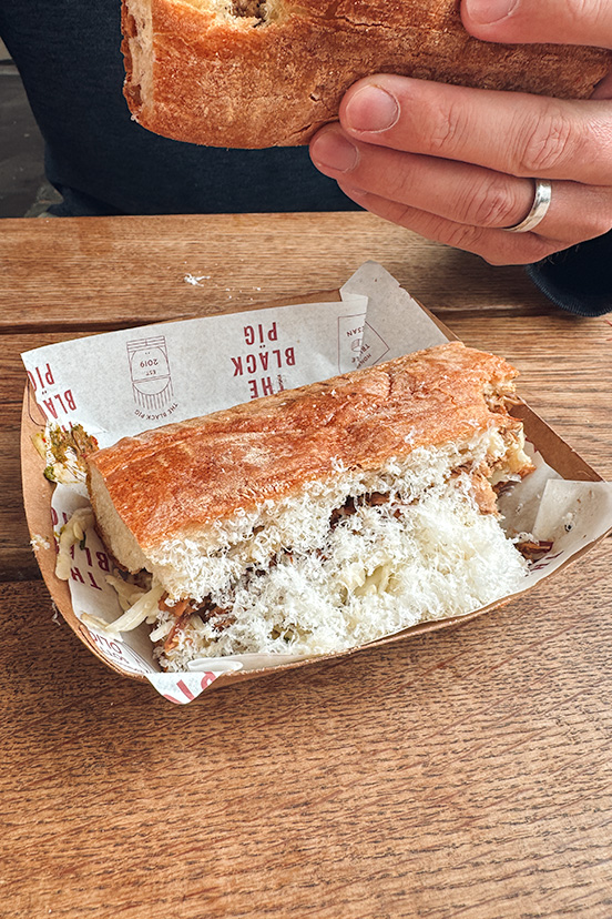 We walked around to see what was there, and once we found the chocolate-covered strawberries, we stopped to try some. Y’all, they were delish, BUT I think you could create the same thing at home. We walked around some more and eventually found The Black Pig. We ordered ‘The Best One’ sandwich, which was a slow-roast pork sandwich with fennel and apple slaw, honey truffle mayo, salsa verde, pepperoncini sott’olio, and 30-month aged Parmesan. Y’all. This sandwich was amazing. I’m a bit disappointed that we didn’t go back for another one. Next time for sure!
