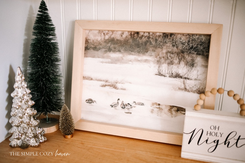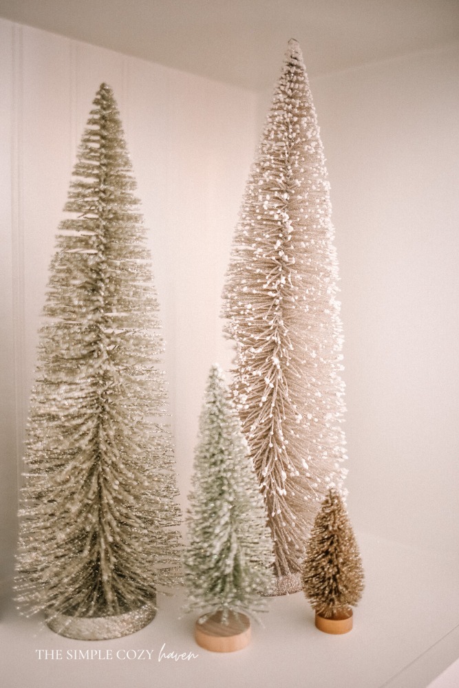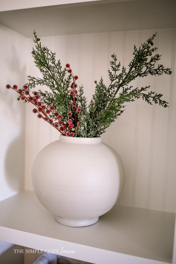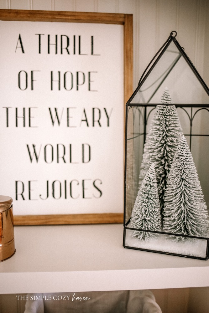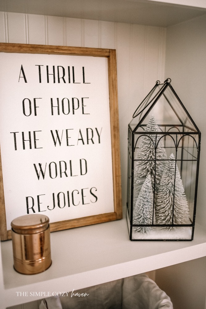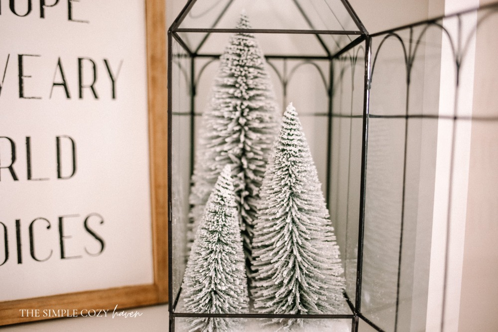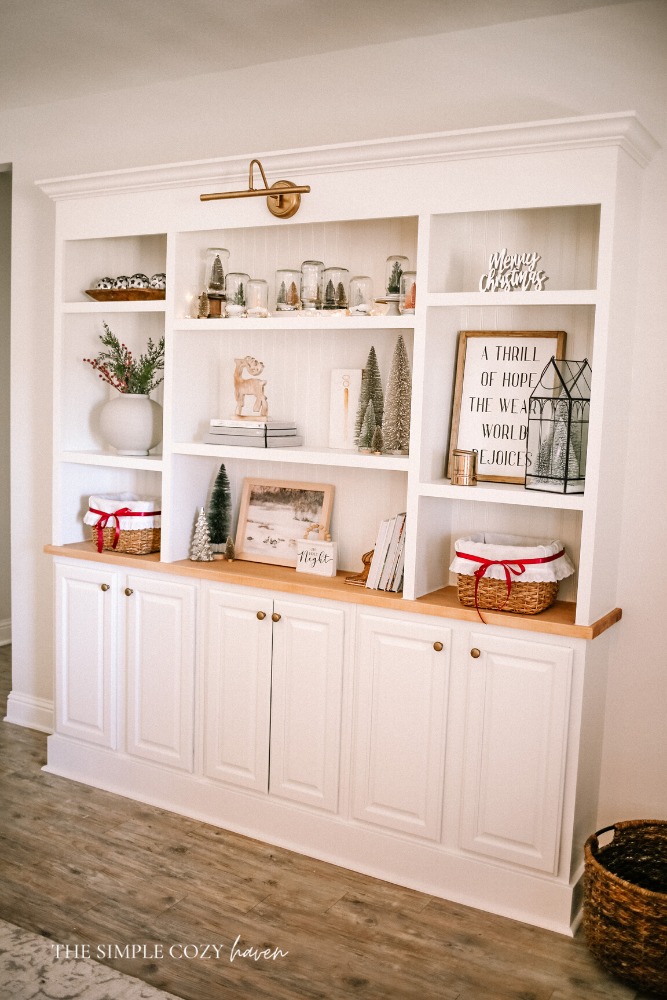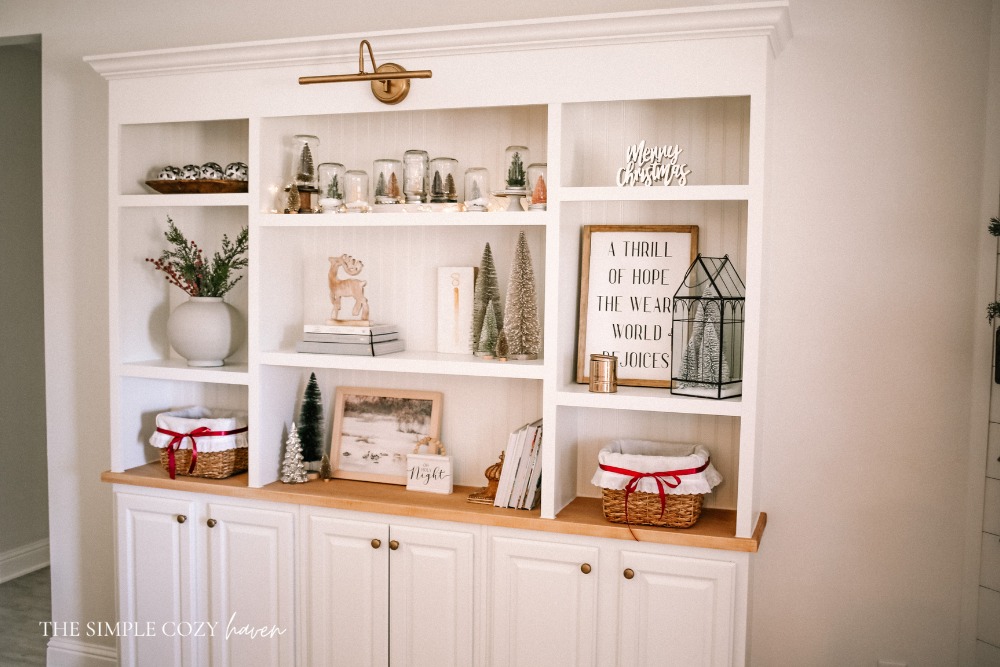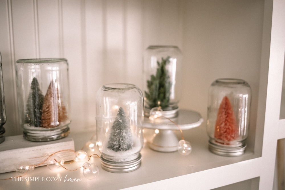 The mason jar “snow globes” are probably my favorite area of this built in. They were so much fun to make and I think they bring such a nostalgic Christmas vibe. I really adore them. All I did was hot glue a small bristle brush tree onto the lid of a mason jar, I even used some old pasta and pickle jars, and add in some faux snow if you want. SO easy!