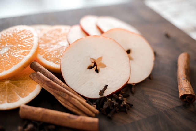 The best fall stovetop potpourri. Apples, oranges, cinnamon sticks and cloves on a cutting board